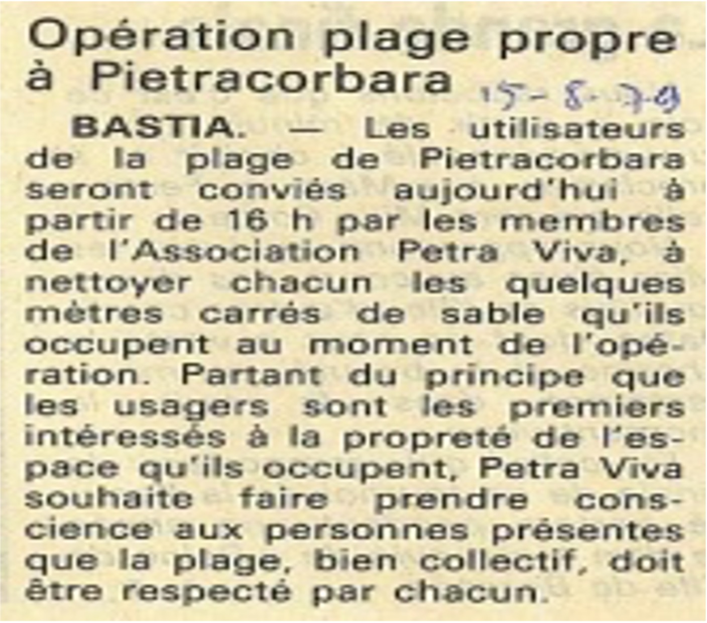 Depuis sa création, en 1976, Petra Viva, l’association pour la défense et la valorisation de la vallée de Pietracorbara, a réalisé de très nombreuses actions au cours de ses 50 années d’existence. Nous avons retenu ici les principales initiatives pour DÉFENDRE la vallée. Elles s’inscrivent dans les cinquante initiatives les plus marquantes qui, pour certaines, ont eu un effet non négligeable en matière d’environnement (la plage, les sentiers) et de restauration du patrimoine bâti (les ponts, les fontaines). De même, les initiatives concernant l’animation du village (fêtes, expositions, concerts) ont été largement relayées par une communication offensive (presse écrite et audiovisuelle, site internet, réseaux sociaux). Tous ces éléments ont participé à la valorisation de la vallée de Pietracorbara.