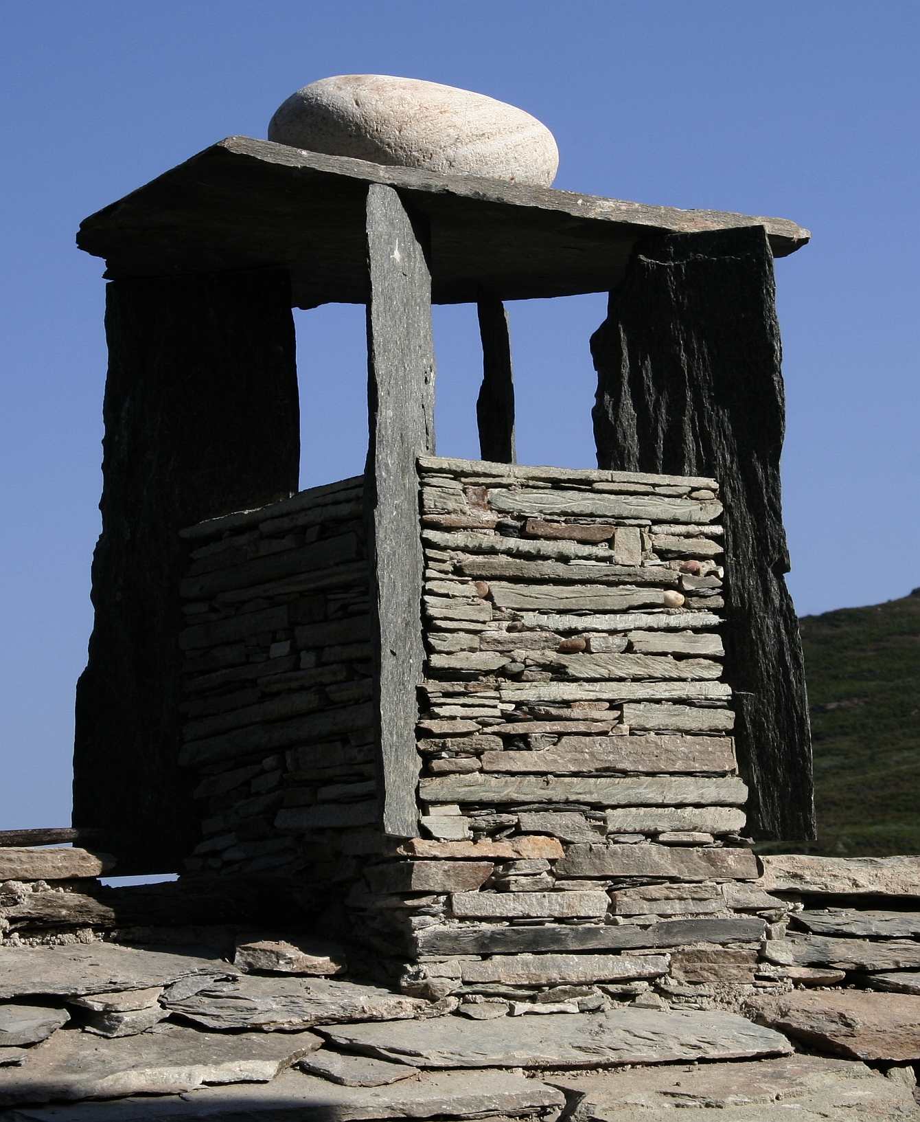 La reconstruction des montants en pierres sèches et du toit à deux pentes a parachevé la renaissance de l’ensemble. Des matériaux traditionnels ont été réemployés : poutres en châtaignier et lauzes du pays (Brandu, Petracurbara et Orezza). Des ardoises venues d’ailleurs ont aussi été utilisées : Argentine, Chine, Inde, Italie et Uruguay. Les artisans ont, de plus, posé deux « petre merlendicce », dites pierres à merle bleu qui marquent les deux extrémités du toit.